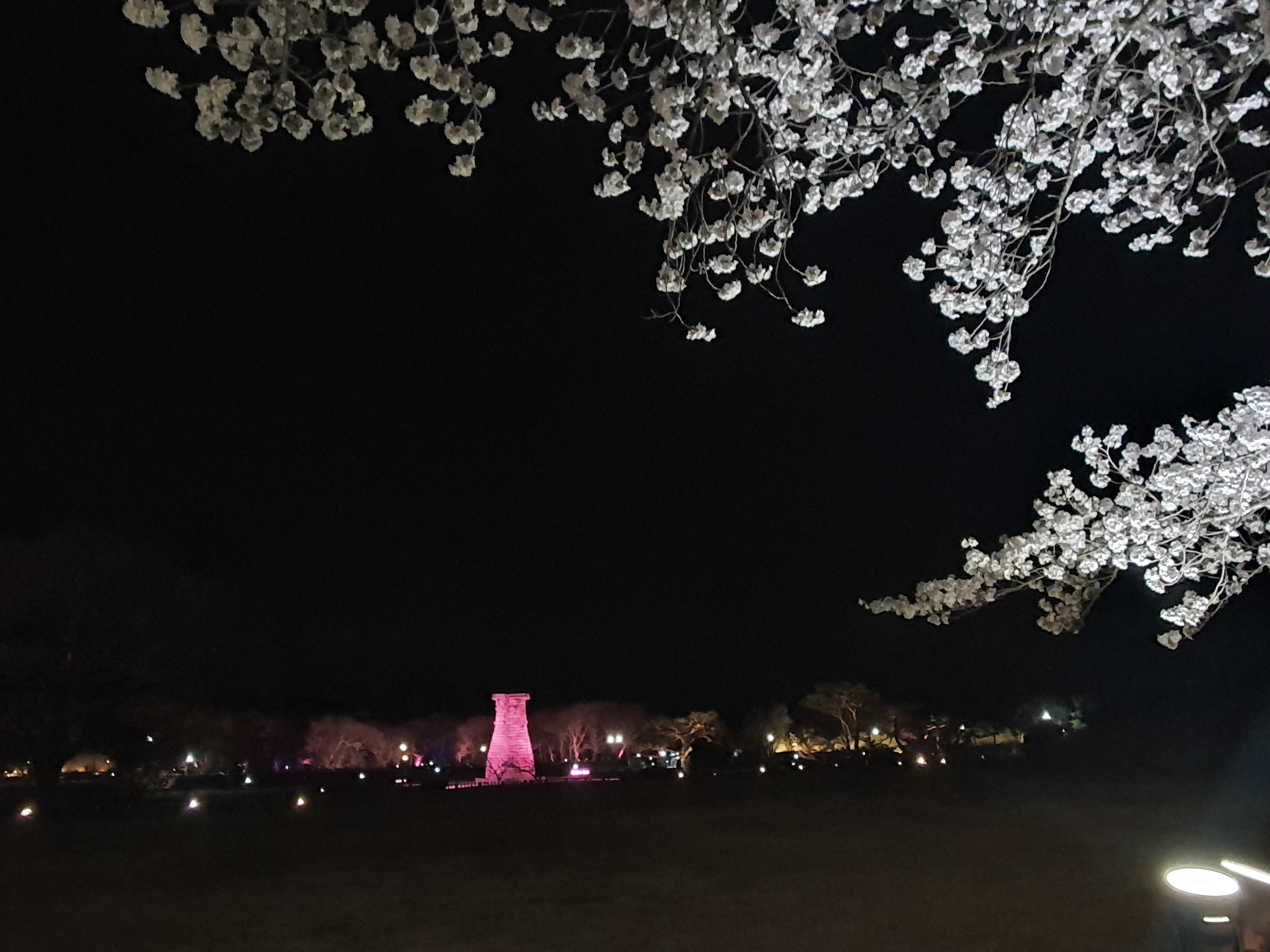 야간 조명 켜진 첨성대 + 벚꽃 조합 = 환상적! ✨