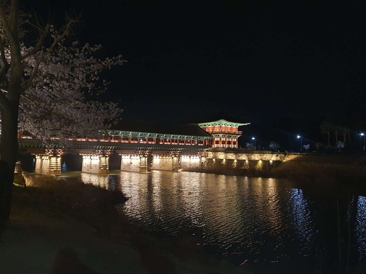 고즈넉한 한옥 다리가 화려한 조명과 함께 빛나서 정말 아름다웠어요.